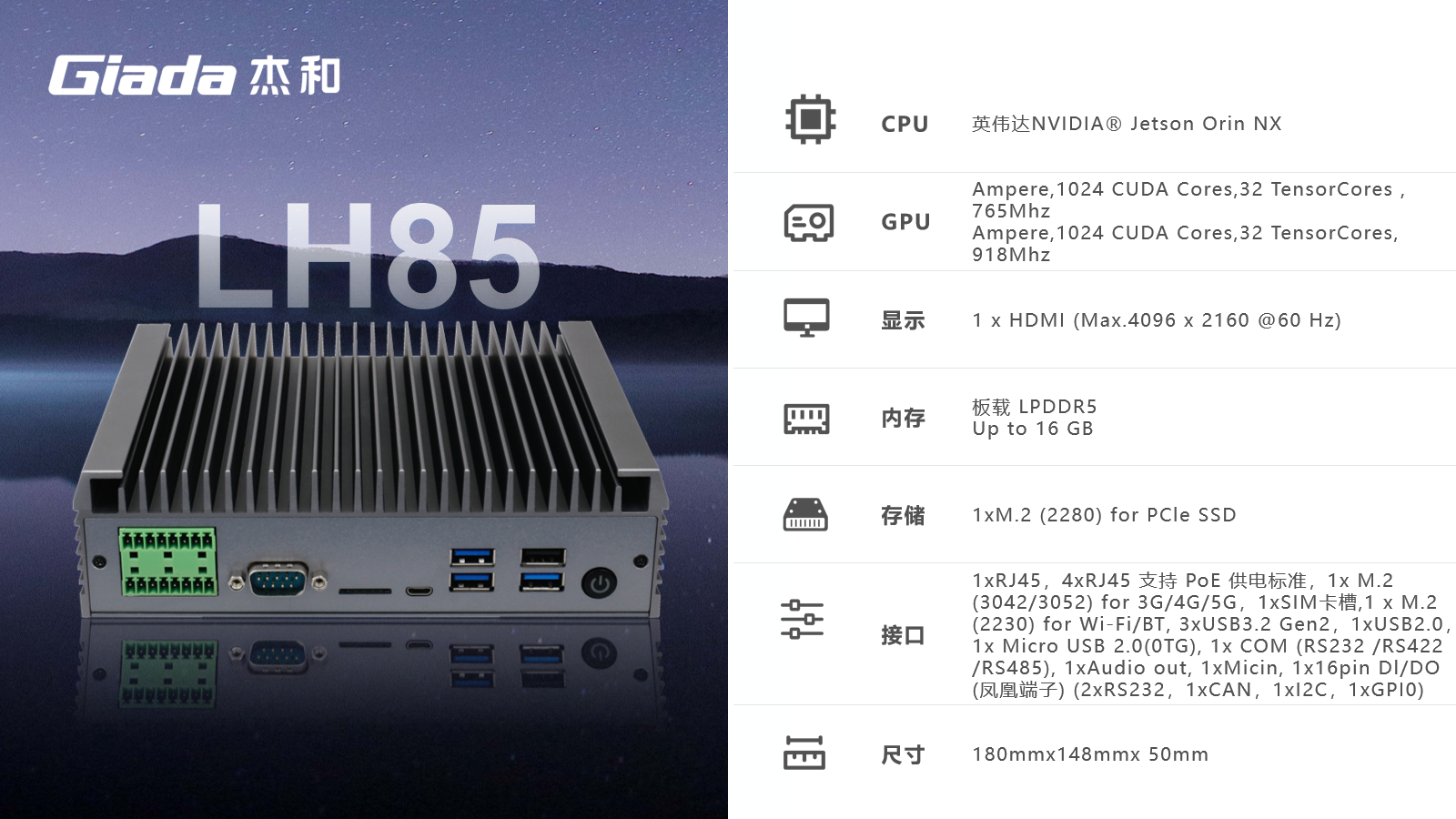 南宫NG·28(中国)相信品牌力量边缘计算产品LH85基于NVidia® Jetson Orin NX套件方案开发,100TOPS超强算力,具备强大的接口配套能力,是全新推出的一代针对边缘计算的创新产品,定位于为工业控制领域客户的AI应用提供强大的算力支持和充足的通信、控制接口保障,可广泛应用于智能制造、机器视觉、AGV、智慧城市等领域。